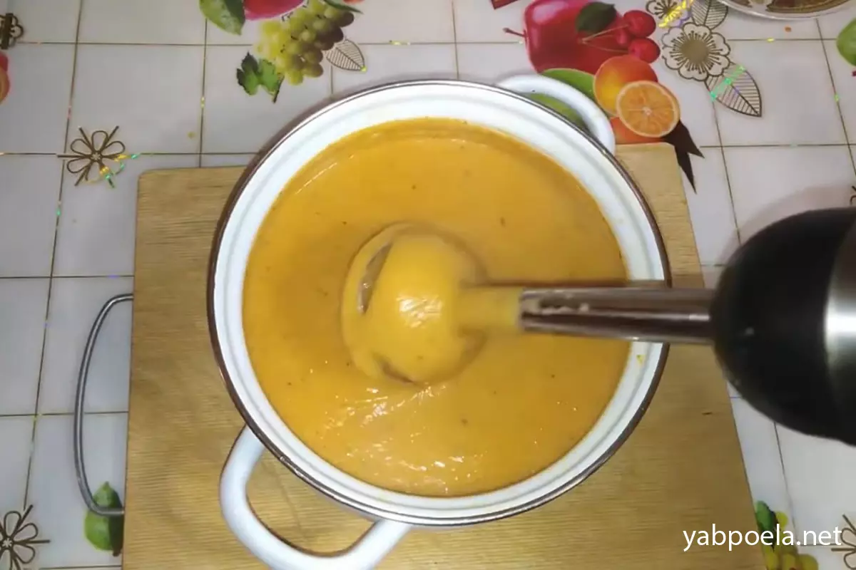 Перебиваем суп погружным блендером до состояния однородного крема.