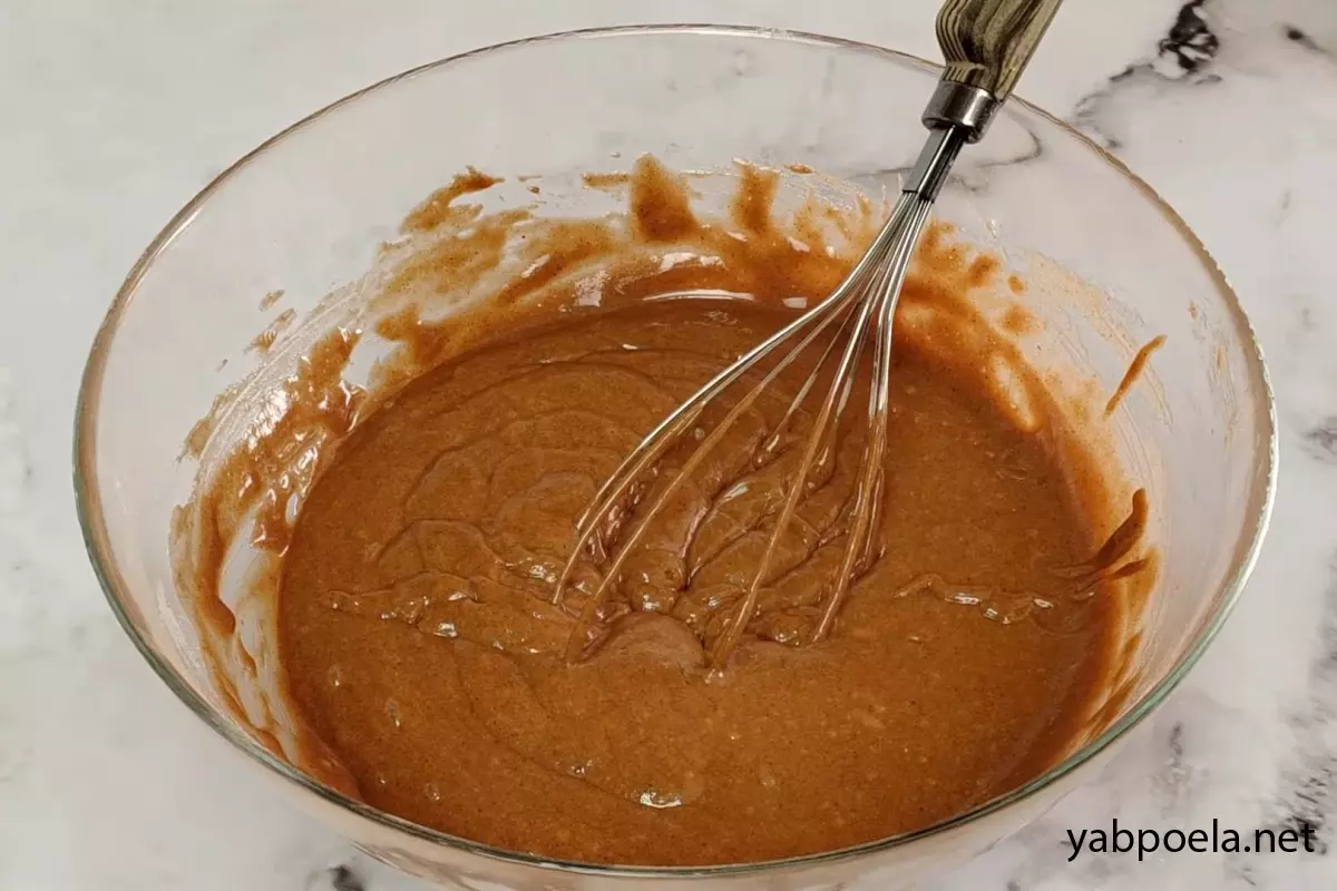 Влейте сладкую медовую воду в сухие ингредиенты. Начните замешивать тесто. Оно должно получиться гладким, без комочков, по консистенции — как густая сметана (не слишком жидкое, но и не густое).