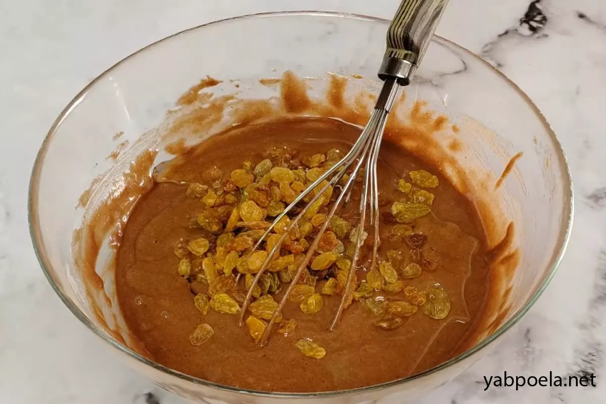 Добавьте в тесто 50 г растительного масла и промытый, обсушенный изюм. Еще раз хорошо перемешайте до объединения ингредиентов.