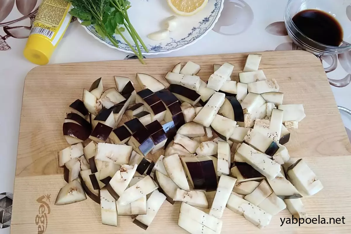 Баклажан нарежьте кубиком. Если сорт горчит — замочите кубики в подсоленной воде на 20 минут, затем слейте жидкость.