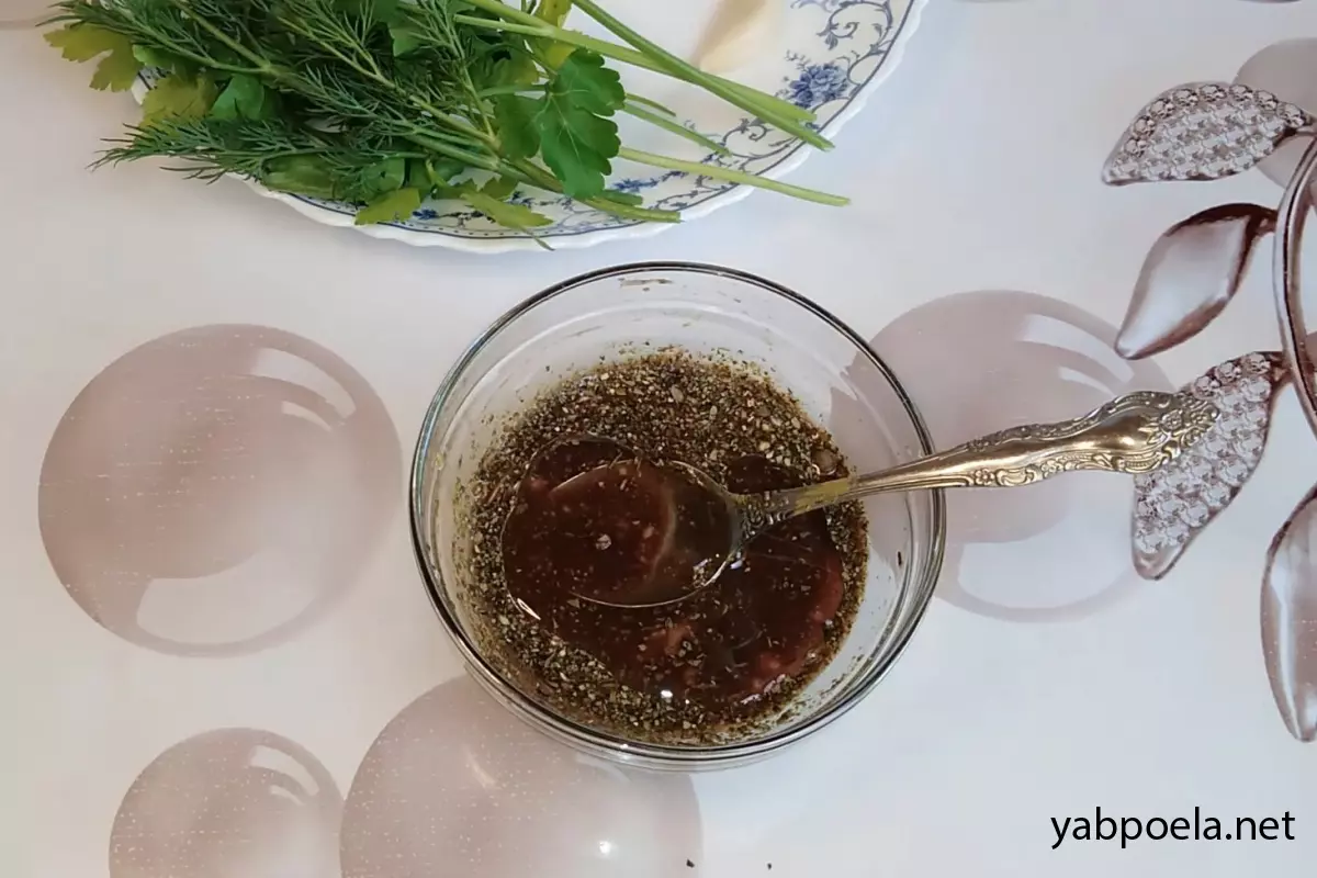 В миске смешайте 1 ст. л. соевого соуса, 0.5 ч. л. горчицы, 1 ст. л. лимонного сока и 1 ст. л. растительного масла (по желанию). Добавьте сушеный базилик и хмели-сунели. Перемешайте.