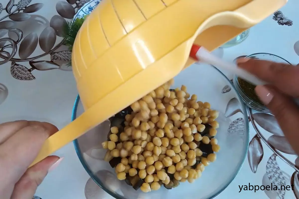 Готовый горячий нут (слив с него воду) соедините в салатнике с тушеными баклажанами.