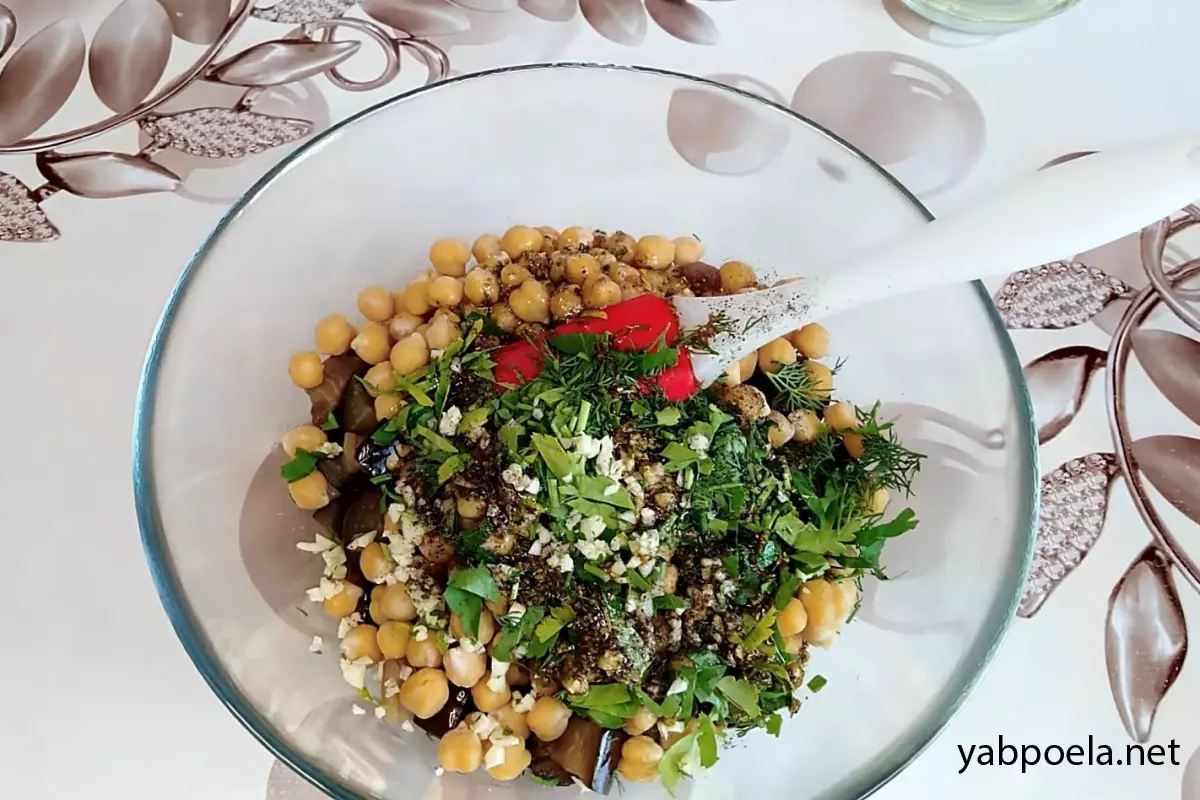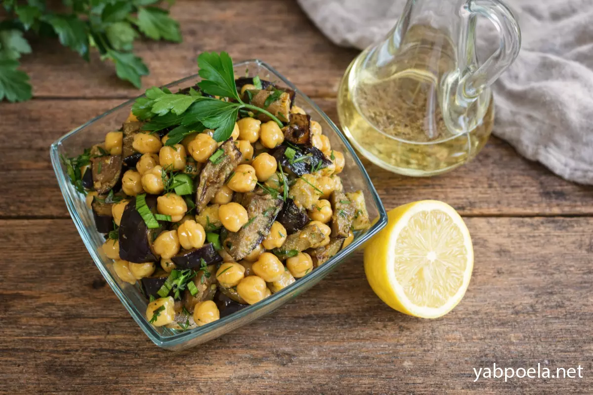Этот рецепт — настоящая находка для тех, кто ищет сытные и полезные блюда без мяса. Нут (турецкий горох) — отличный источник растительного белка, а в сочетании с баклажанами и пикантной заправкой он превращается в полноценное блюдо. Салат получается пряным, ароматным и очень насыщенным.