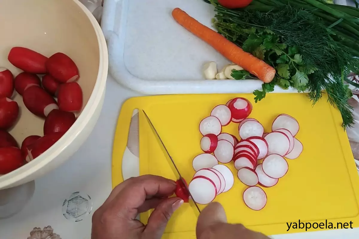 Нарежьте редиску кружочками или полукольцами средней толщины. Переложите в объемную миску или кастрюлю.