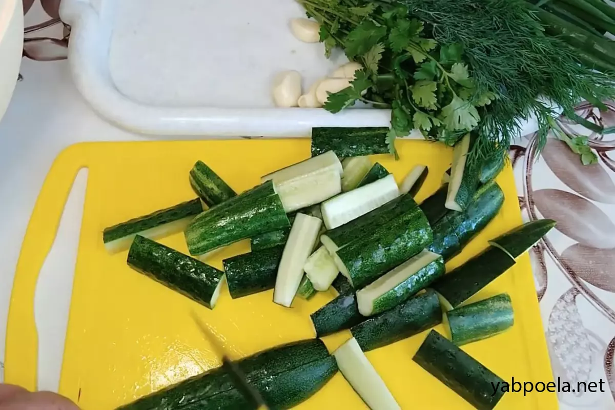 Огурцы также нарежьте средними кусочками и отправьте всё к редиске.