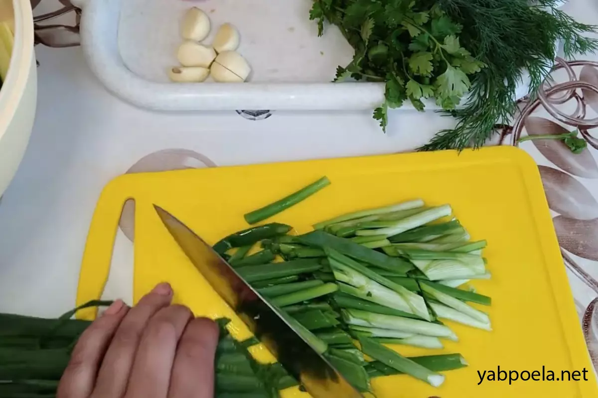 Зеленый лук нарежьте крупно (наискосок), слишком жесткие белые части можно убрать.