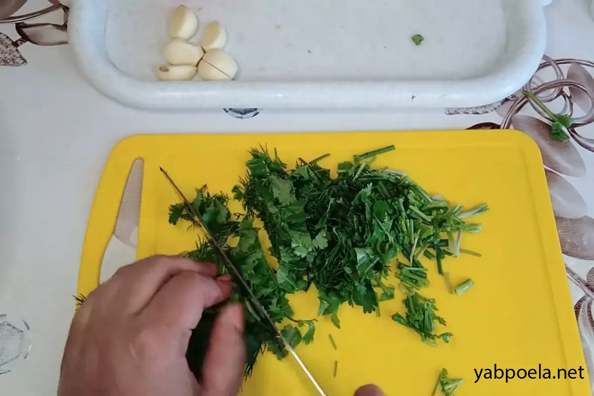 Кинзу и укроп нарубите не слишком мелко. Отправьте всю зелень к овощам.
