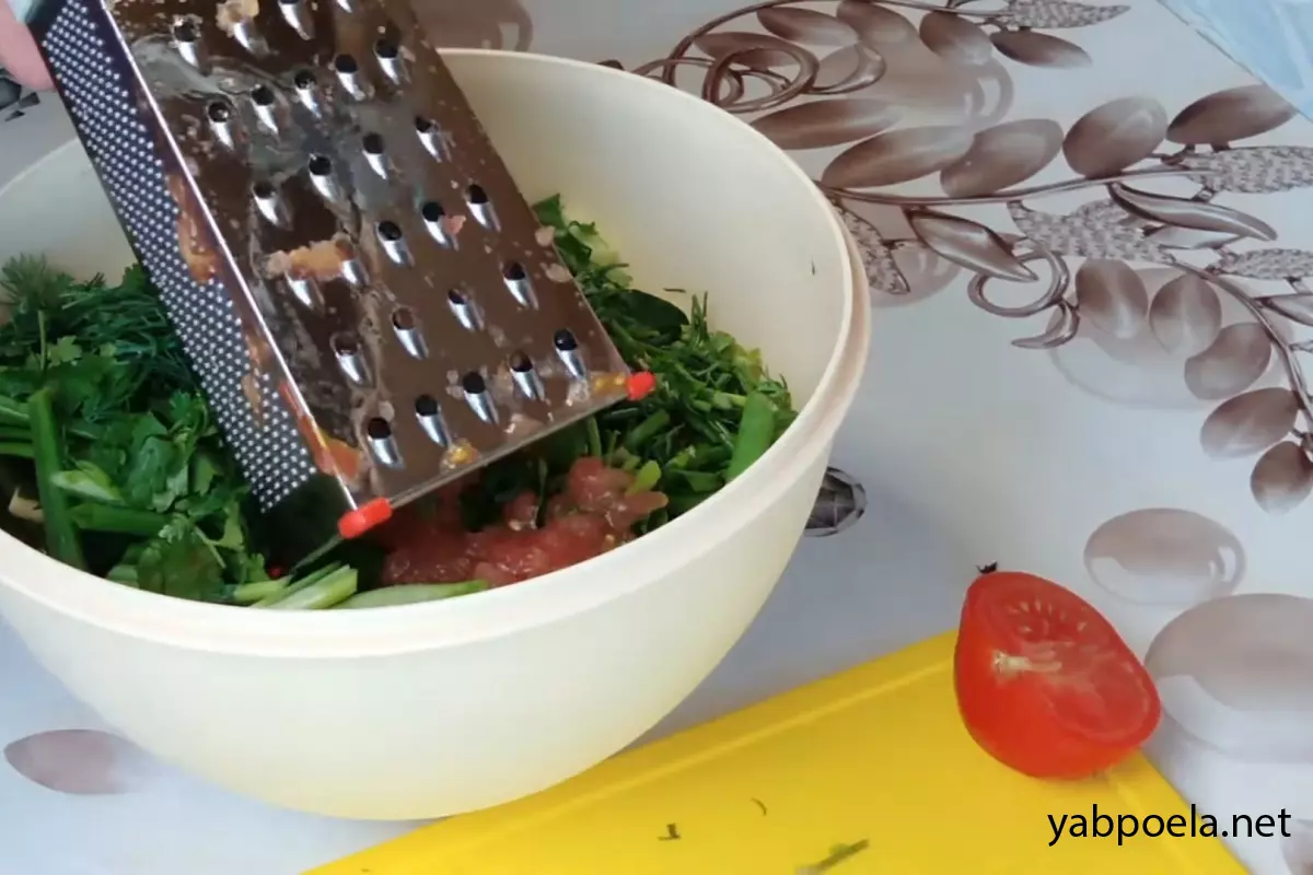 Помидор разрежьте пополам и натрите на крупной терке так, чтобы кожица осталась в руках (она не понадобится). Добавьте чеснок и томатное пюре в общую емкость.