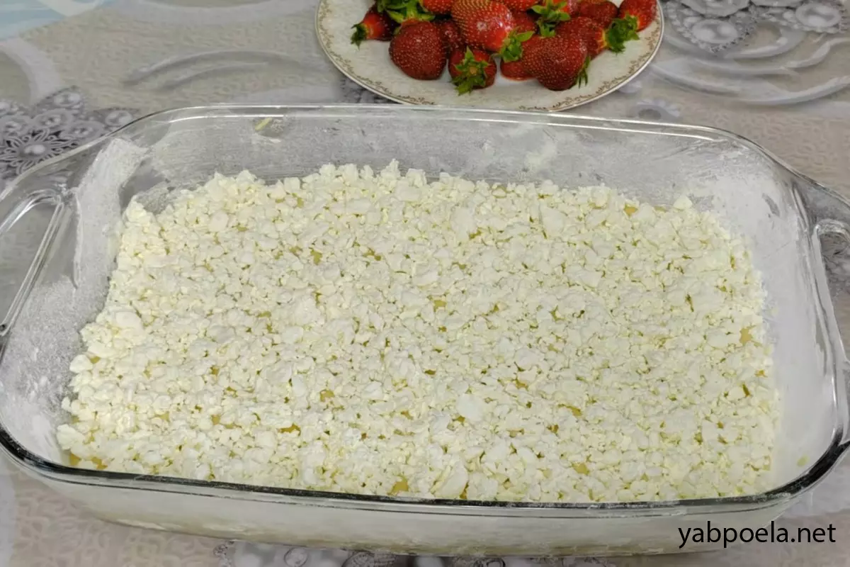 Поверх сырого теста равномерно рассыпьте творог (200–250 г).