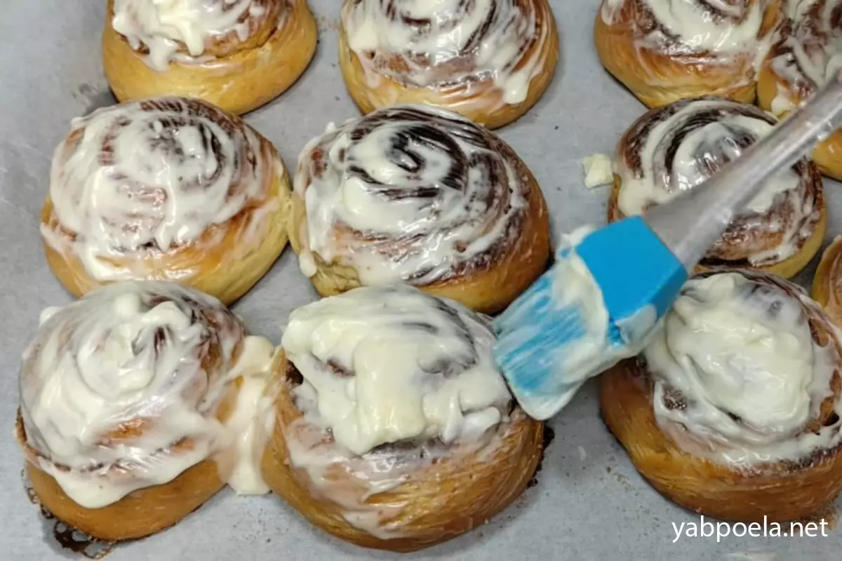 Достаньте готовые горячие булочки из духовки. Сразу же нанесите на них часть глазури — она быстро растает и пропитает пористое тесто. Спустя пару минут распределите оставшийся крем.
