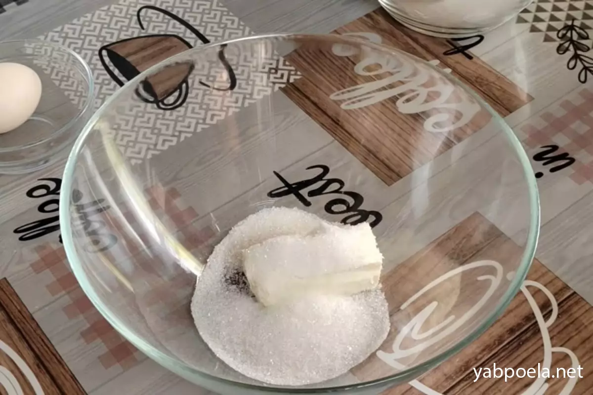 В глубокой миске разотрите 50 г очень мягкого сливочного масла с 2 ст. л. сахара и 1/3 ч. л. соли. Долго взбивать не нужно, достаточно просто хорошо смешать.