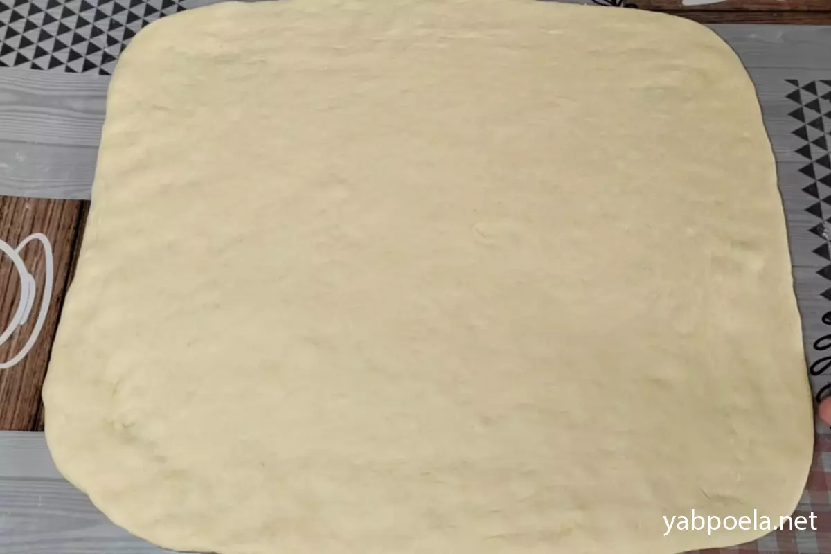 Подошедшее воздушное тесто переложите на присыпанный мукой стол и слегка обомните. Раскатайте его скалкой в прямоугольный пласт размером примерно 30х40 см. Толщина теста должна быть около 5–7 мм.