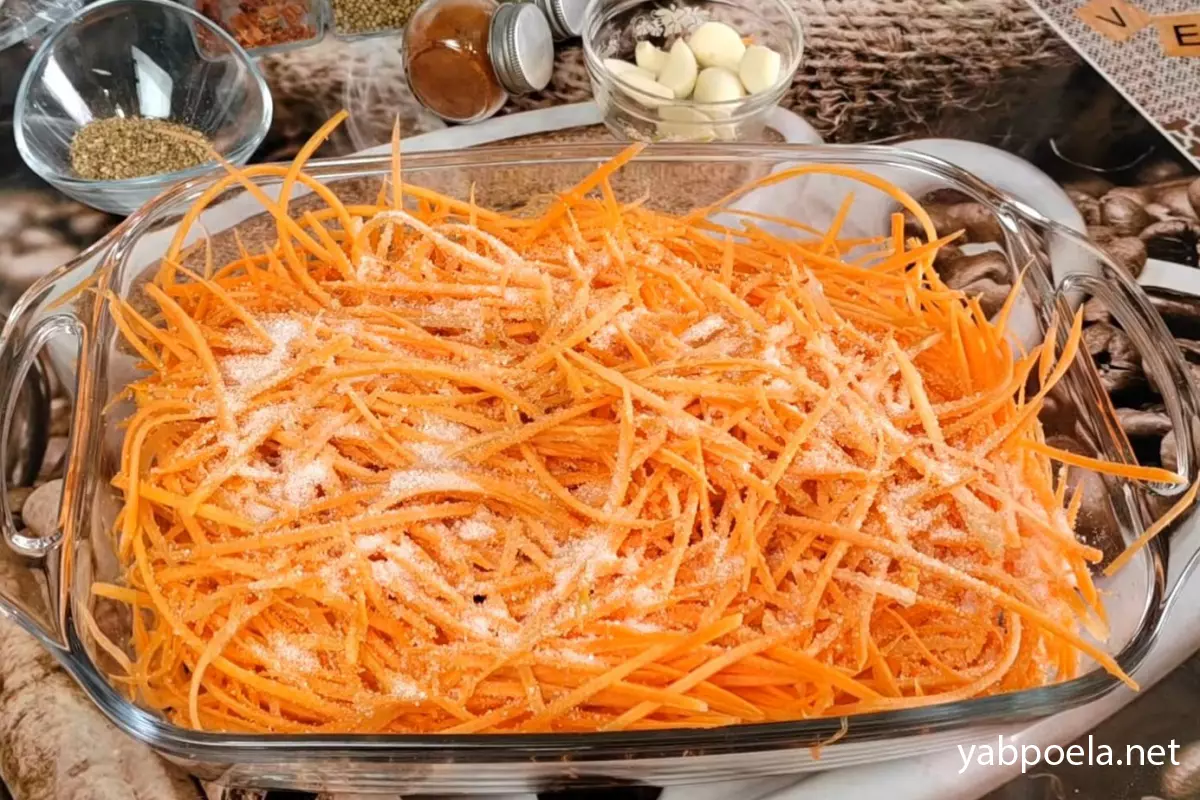 Важно: Оставьте морковь прямо на столе на 5–10 минут. Соль и сахар быстро вытянут из неё лишнюю жидкость, и морковка на глазах обмякнет.