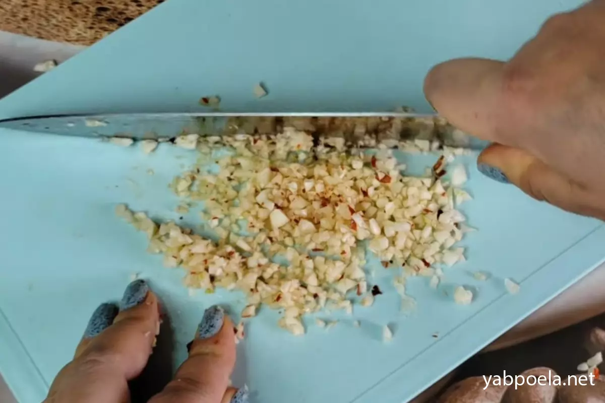 Пока морковь пускает сок, возьмите 7–8 зубчиков чеснока и примерно 0.5 ч. л. острого перца (хлопьями или свежего) и мелко нарубите их ножом все вместе, чтобы вкусы начали объединяться. Если используете просто молотый острый перец, нарубите только чеснок.