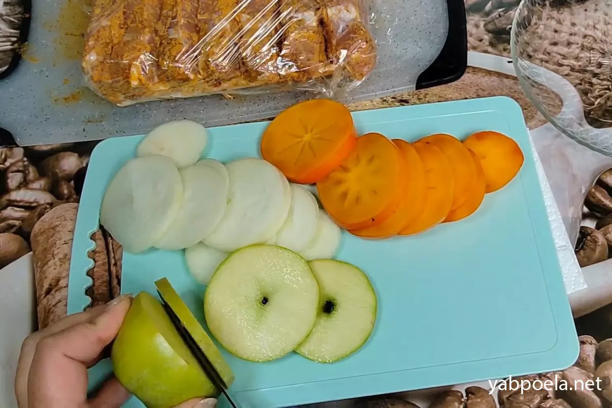 Пока мясо отдыхает, подготовьте начинку. Кислые яблоки, плотную хурму и репчатый лук нарежьте аккуратными кольцами или полукольцами.