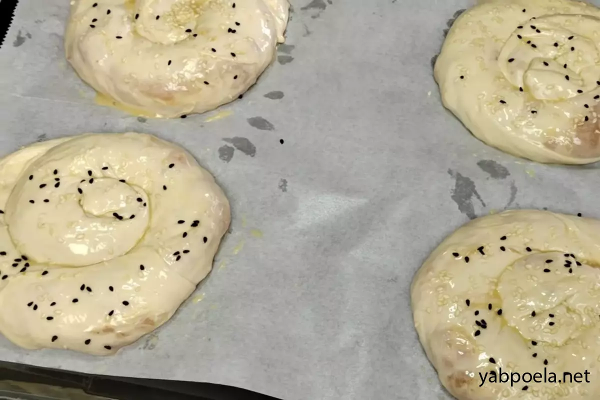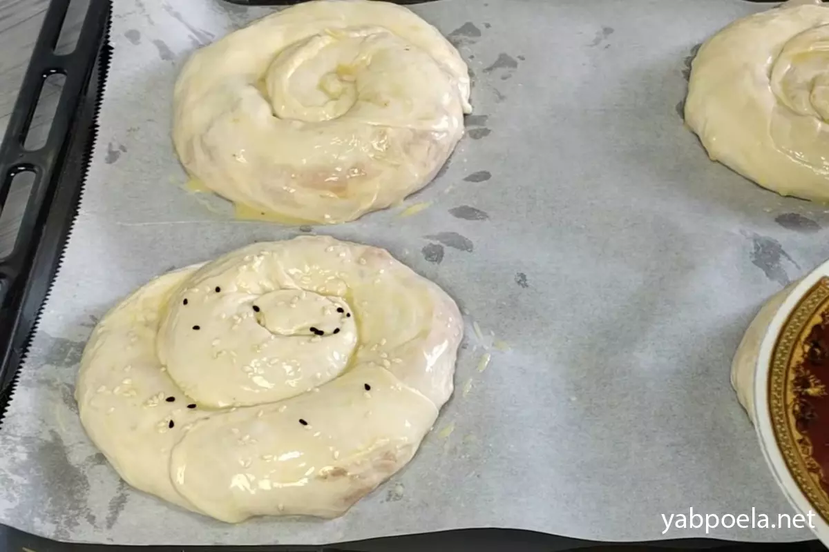Переложите сформированные пироги на противень (застеленный пергаментом). Сверху смажьте каждую улитку взбитым яйцом и, по желанию, обильно присыпьте кунжутом. Тем временем разогрейте духовку до 200°C.