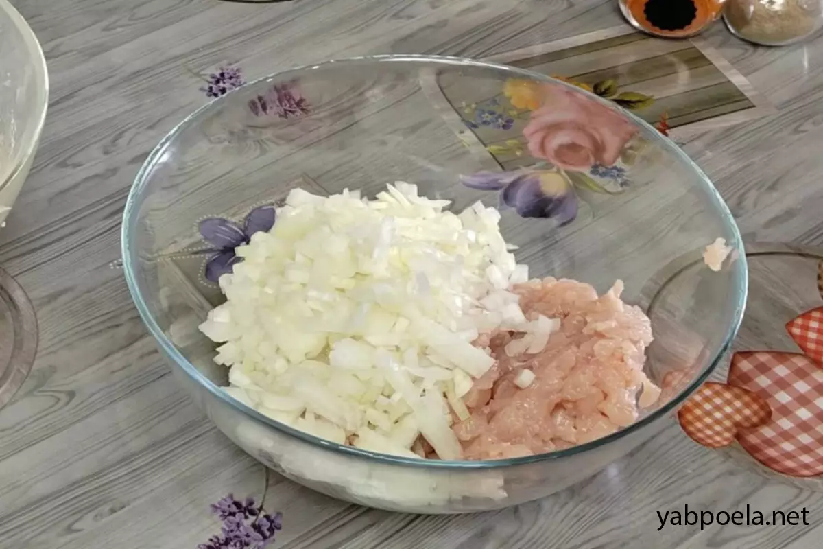 Пока тесто отдыхает, мелко нарежьте куриную грудку кубиком (удобнее всего резать слегка подмороженное мясо). Две средние луковицы также нарежьте максимально мелко (лук даст необходимую сочность). По желанию добавьте мелко нарезанную половинку болгарского перца.