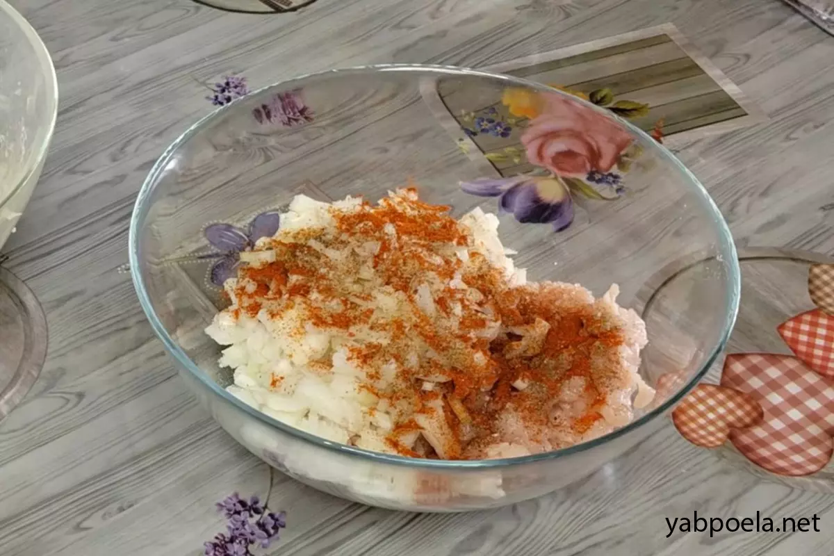 К мясу и луку добавьте соль, черный молотый перец, сладкую паприку и 0.5 ч. л. зиры. Тщательно перемешайте начинку.