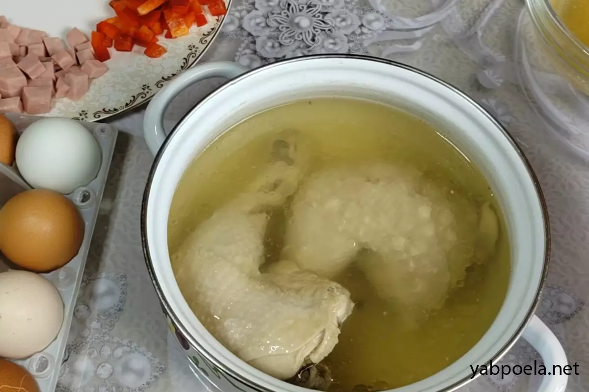 Заранее отварите пару куриных окорочков. Чтобы заливное получилось по-настоящему вкусным, обязательно добавьте при варке соль, лавровый лист и перцы горошком. Готовую курицу достаньте и остудите, а получившийся наваристый бульон процедите и также дайте ему полностью остыть.
