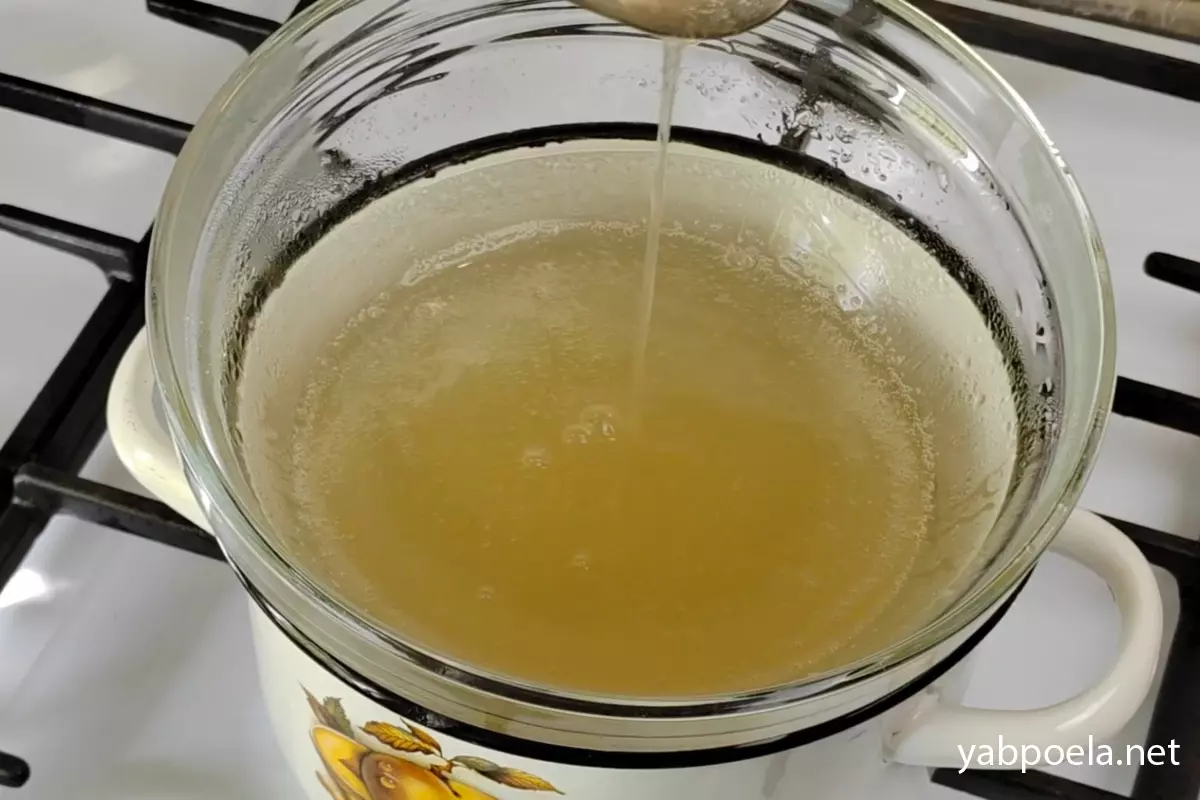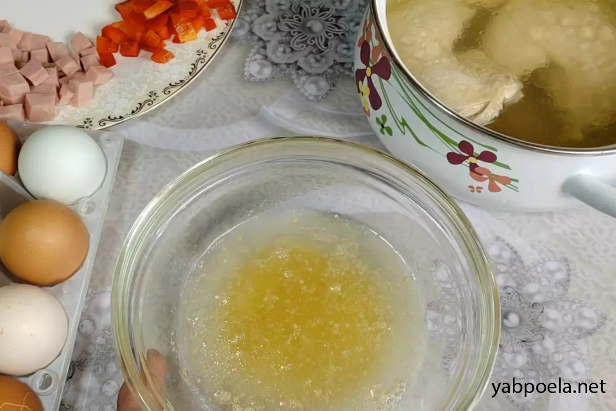 Влейте растопленный желатин в оставшиеся 300 мл прозрачного куриного бульона. Тщательно перемешайте жидкость.