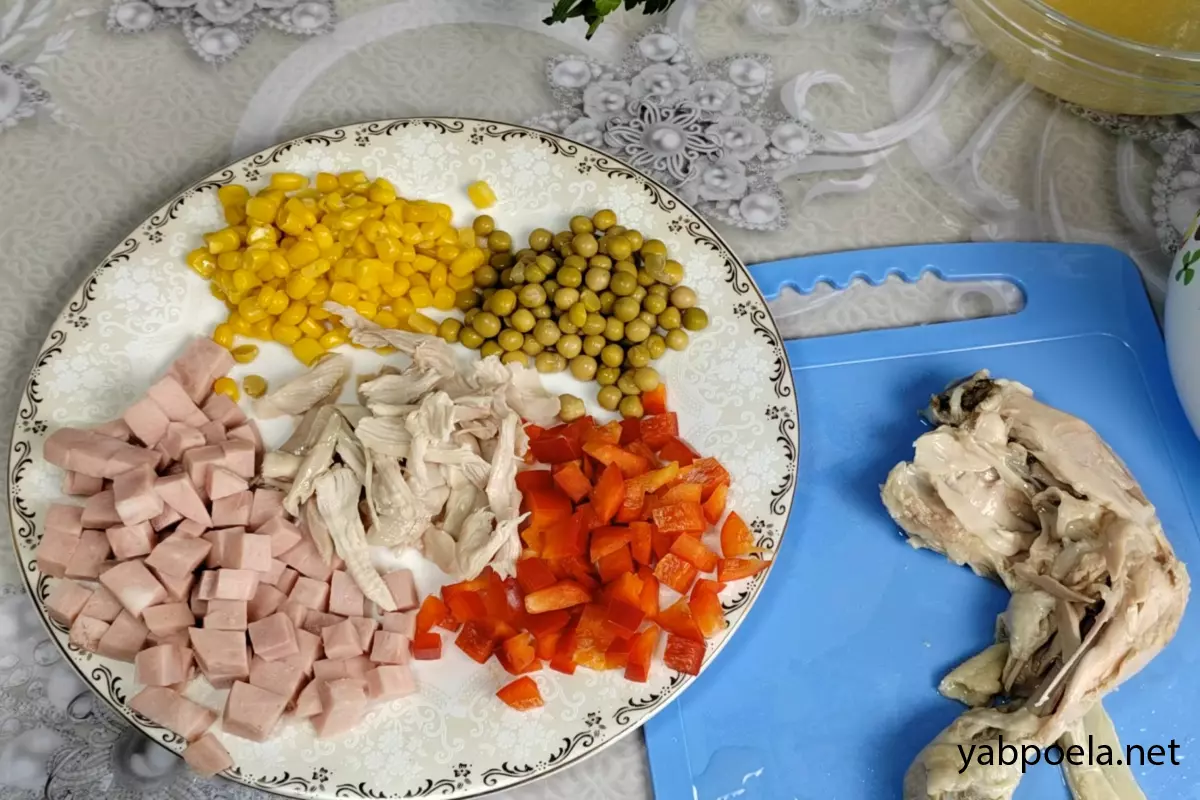 С остывших отварных окорочков снимите кожу (она не понадобится). Мясо разберите на мелкие волокна или нарежьте аккуратным кубиком. Ветчину и половинку свежего болгарского перца также нарежьте мелким кубиком. Слейте жидкость с консервированного горошка и кукурузы.