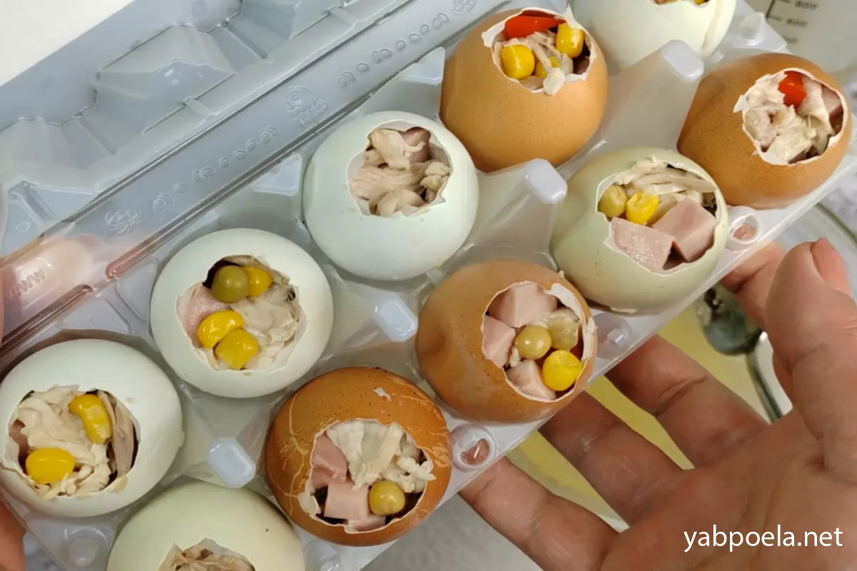 В подготовленные сухие скорлупки слоями или в хаотичном порядке выложите начинку: кусочки курицы, ветчину, перец, кукурузу, горошек и листики свежей зелени.