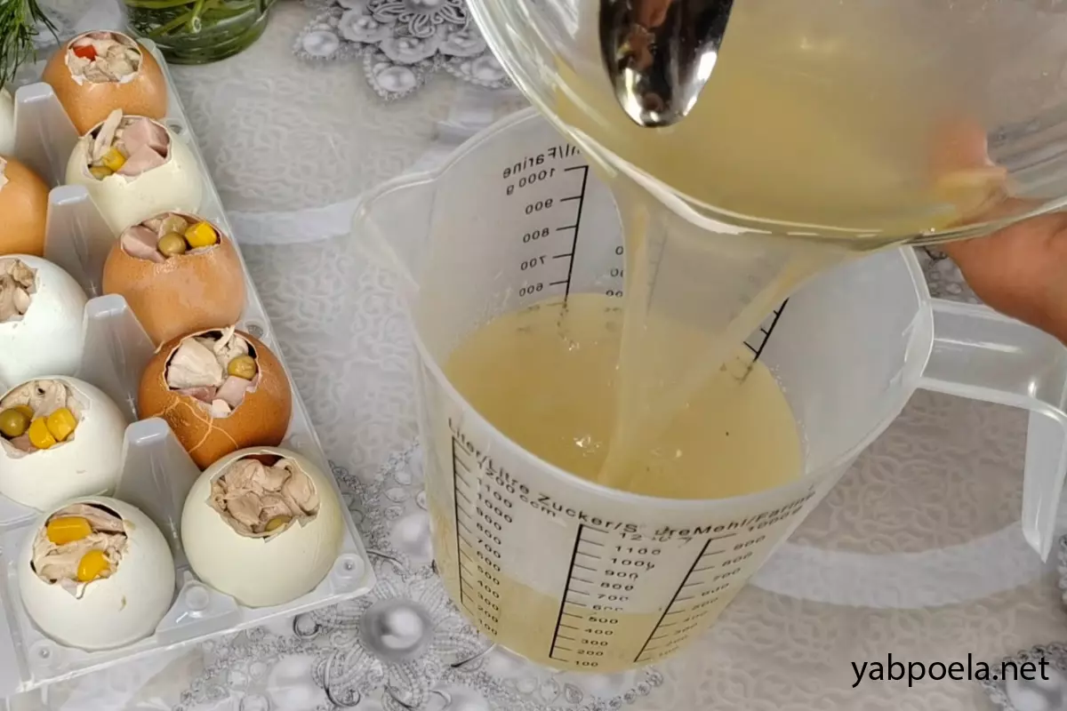 Аккуратно, понемногу вливайте бульон с желатином в каждое яйцо. Возьмите зубочистку и аккуратно проткните начинку внутри каждого яйца до самого дна. Это поможет выпустить застрявшие пузырьки воздуха. После этого долейте бульон до самых краев скорлупы.
