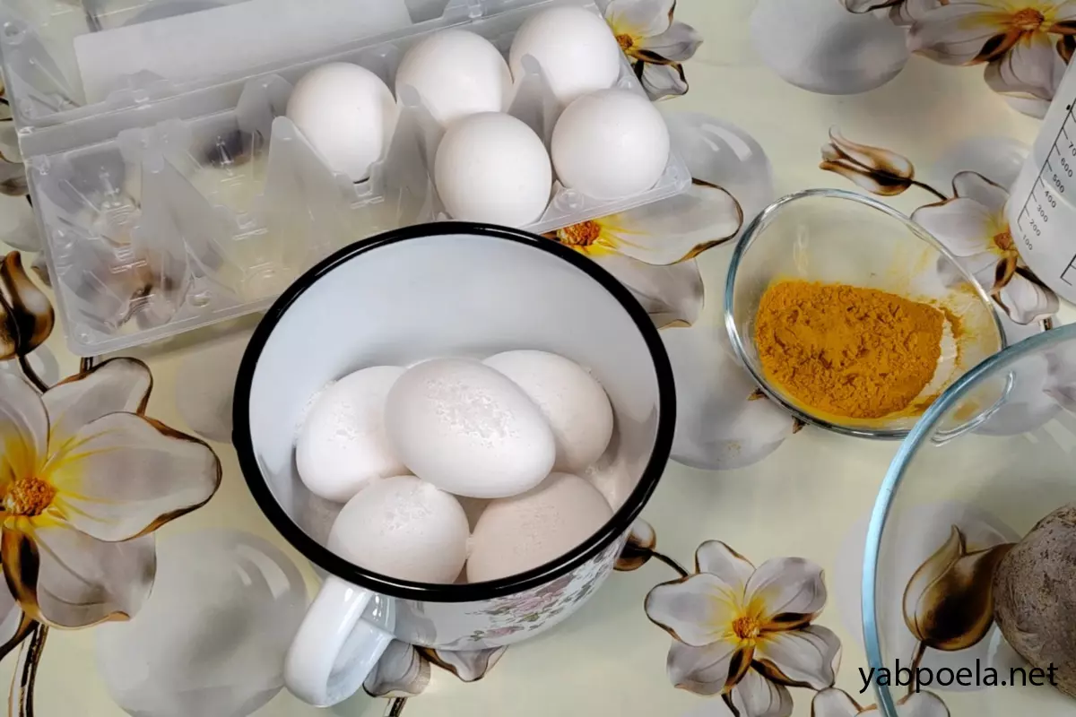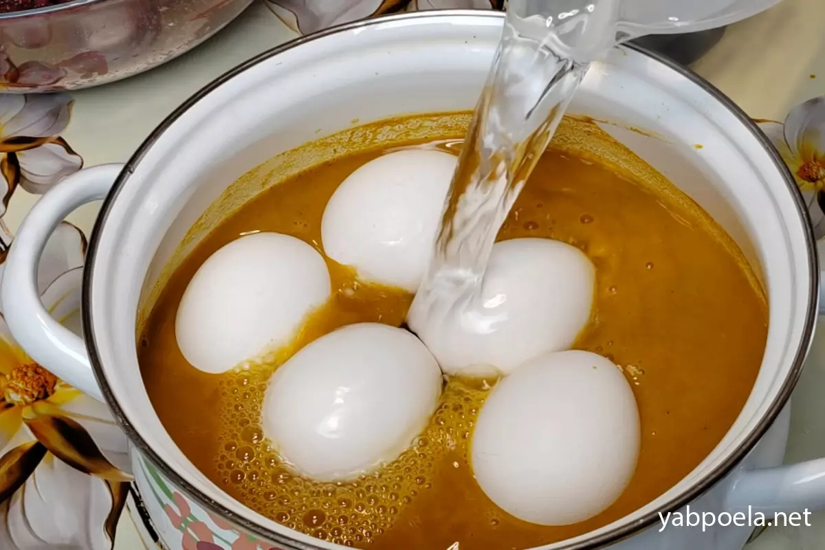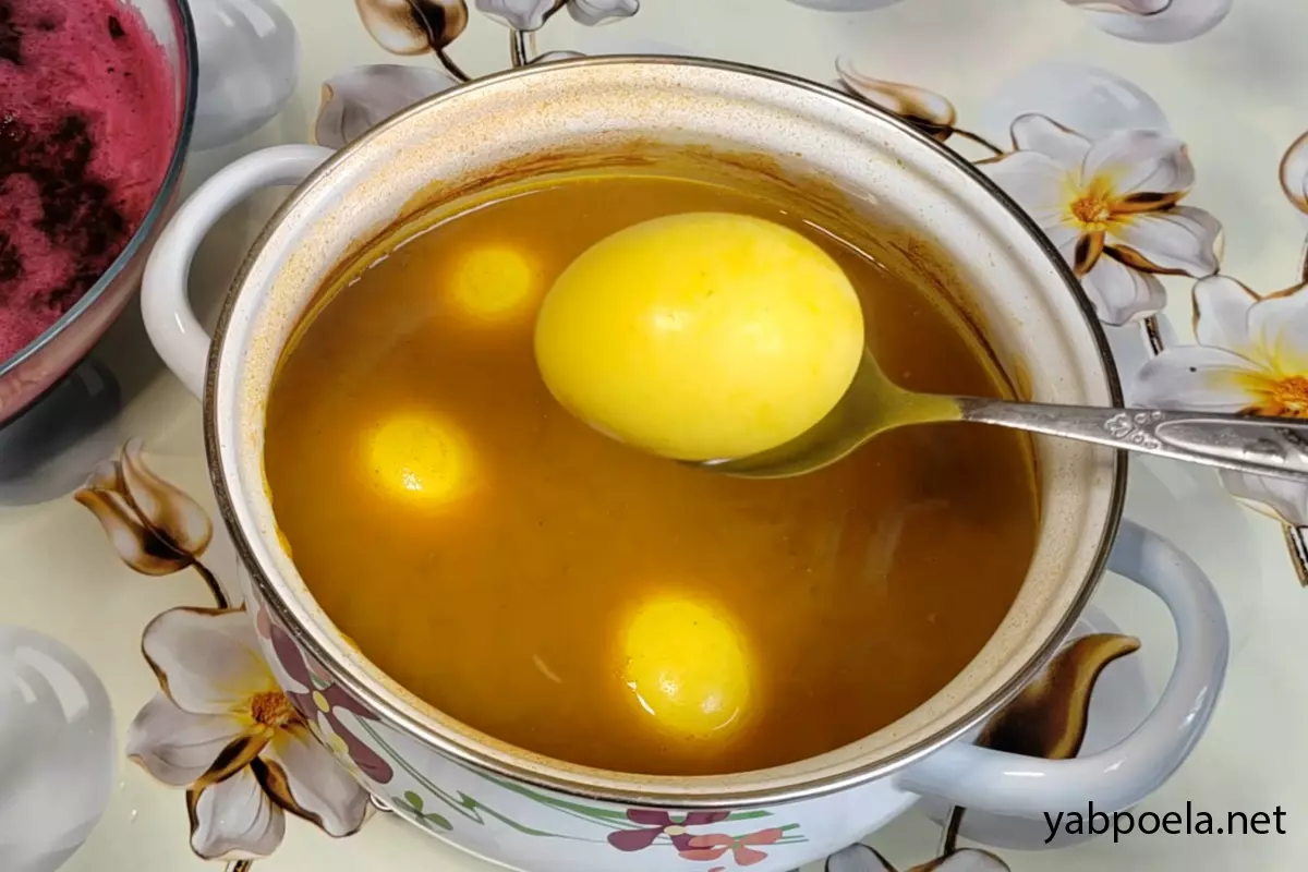 После варки вы можете сразу достать яйца (они уже будут желтыми), но для глубокого, насыщенного цвета оставьте их остывать прямо в отваре с куркумой еще на 20–30 минут.