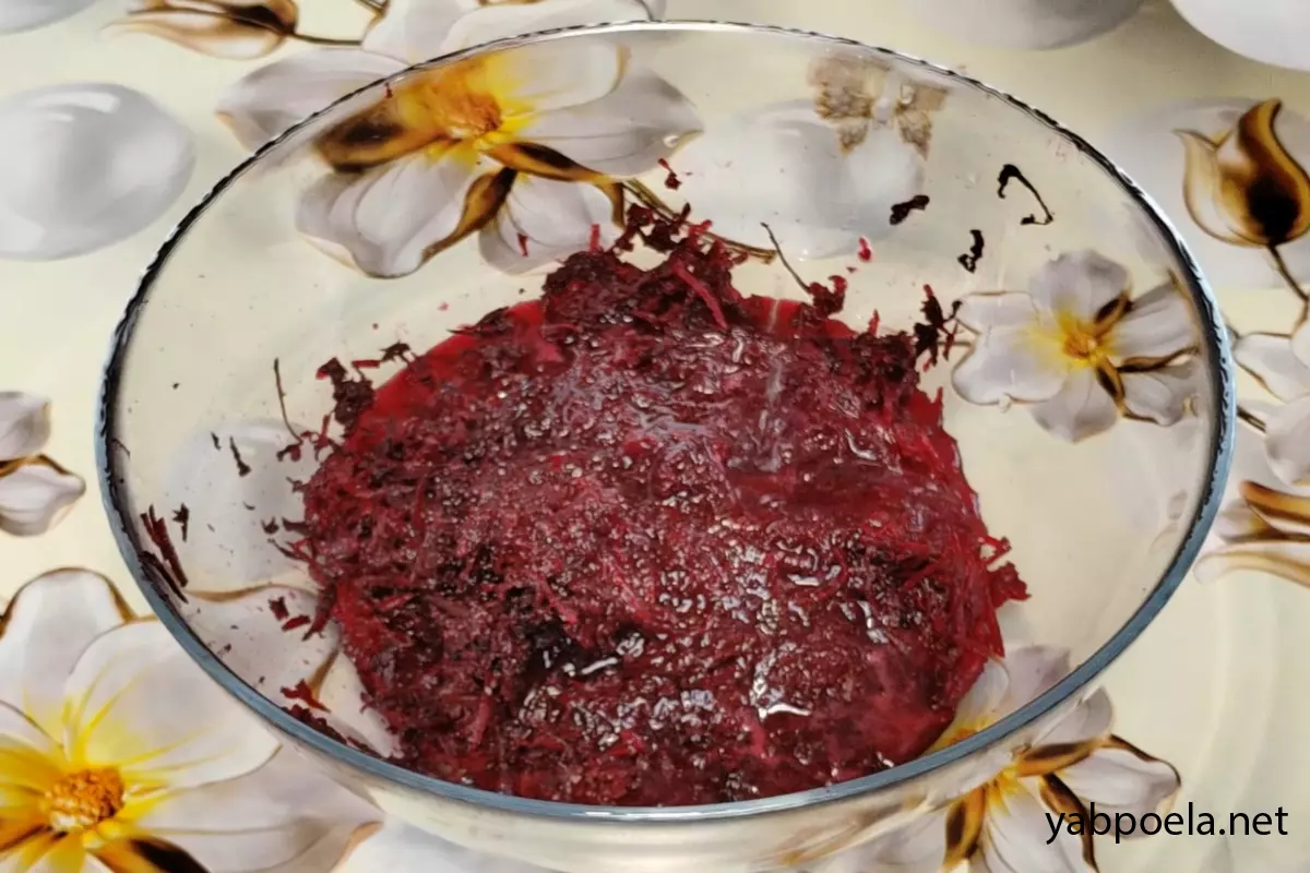 Пока яйца варятся, сырую неочищенную свеклу хорошо вымойте и натрите на мелкой терке. Переложите массу в глубокую миску. Добавьте 1 ст. л. уксуса 9% (он закрепит цвет и сделает его ярче) и влейте примерно полстакана воды. Тщательно перемешайте.
