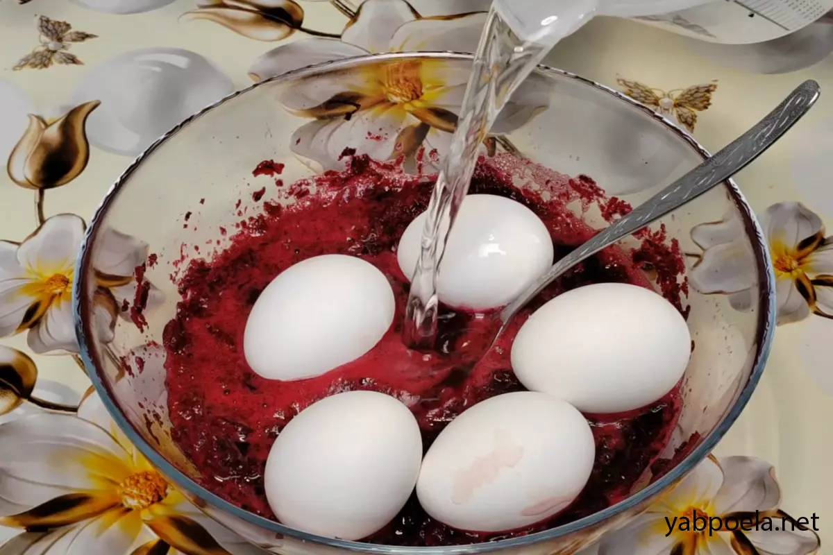 Снимите сварившиеся яйца с плиты. Сразу же, пока они горячие, переложите их в миску со свекольной массой. Слегка утопите их в кашице и долейте немного холодной воды, чтобы яйца были полностью покрыты жидкостью.
