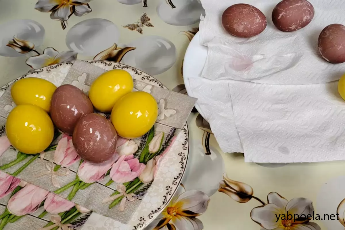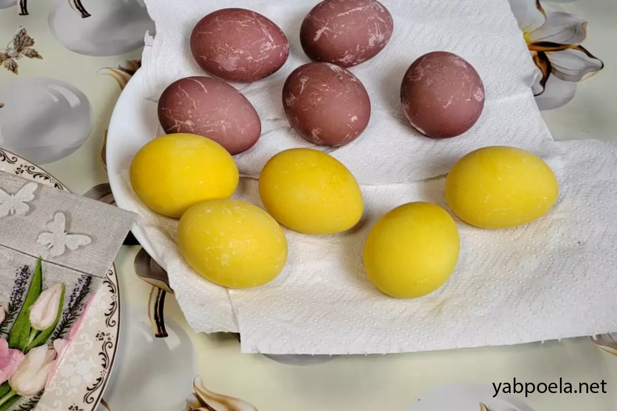 Когда цвет вас полностью устроит, достаньте яйца из растворов и аккуратно ополосните их в чистой воде от остатков тертой свеклы и порошка куркумы. Выложите крашенки на бумажное полотенце и дайте им полностью высохнуть.
