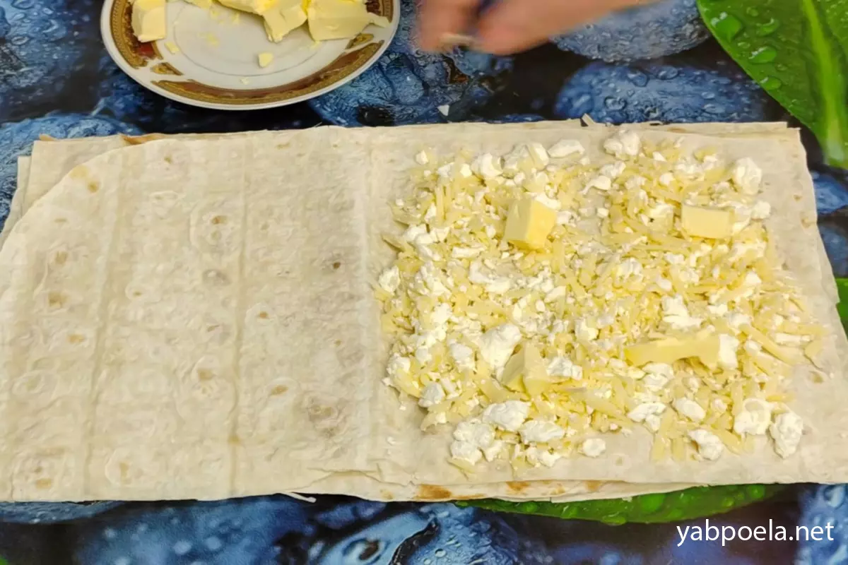 Возьмите один лист лаваша. Визуально разделите его пополам. На одну половину выложите часть начинки (начинку тоже визуально разделите на 4 равные части, чтобы хватило на все листы). Поверх сырной массы раскидайте несколько маленьких кусочков сливочного масла.