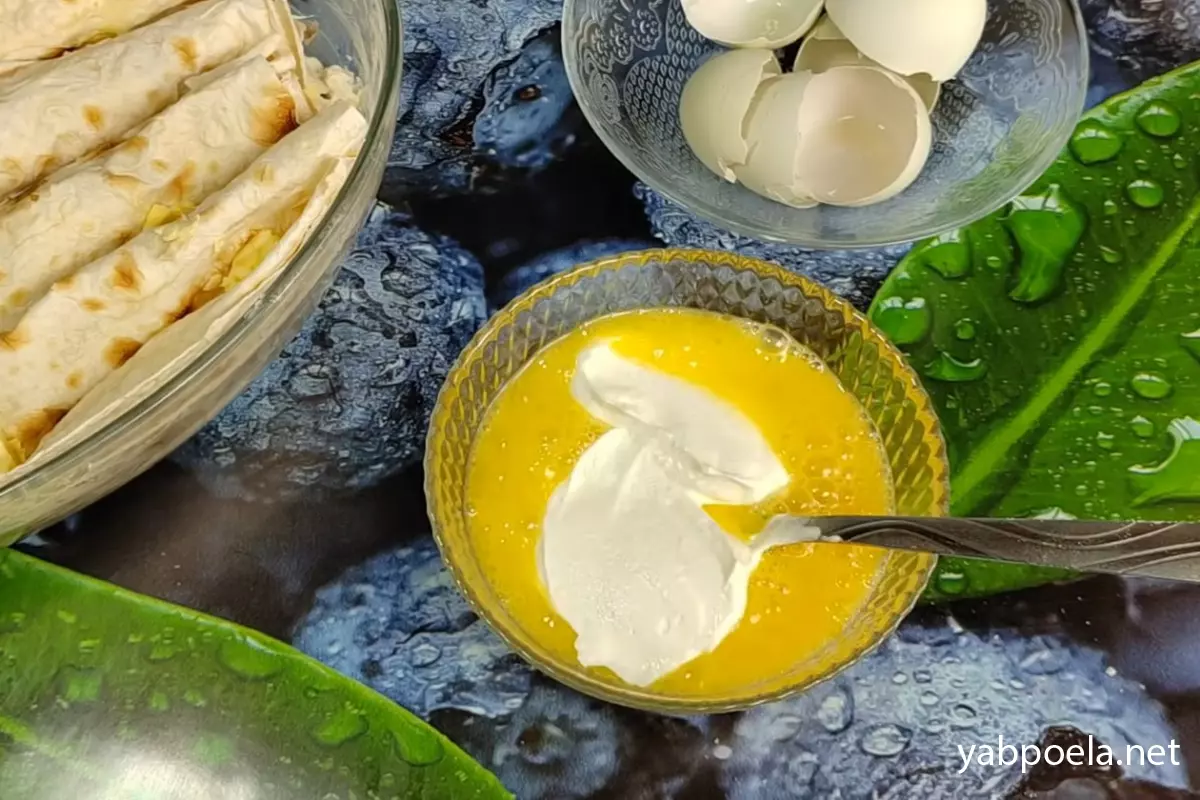 В отдельной мисочке слегка взбейте вилкой 3 яйца с небольшой щепоткой соли. Добавьте 3 полные столовые ложки сметаны и тщательно перемешайте до однородного состояния. Тем временем включите духовку разогреваться до 180°C.