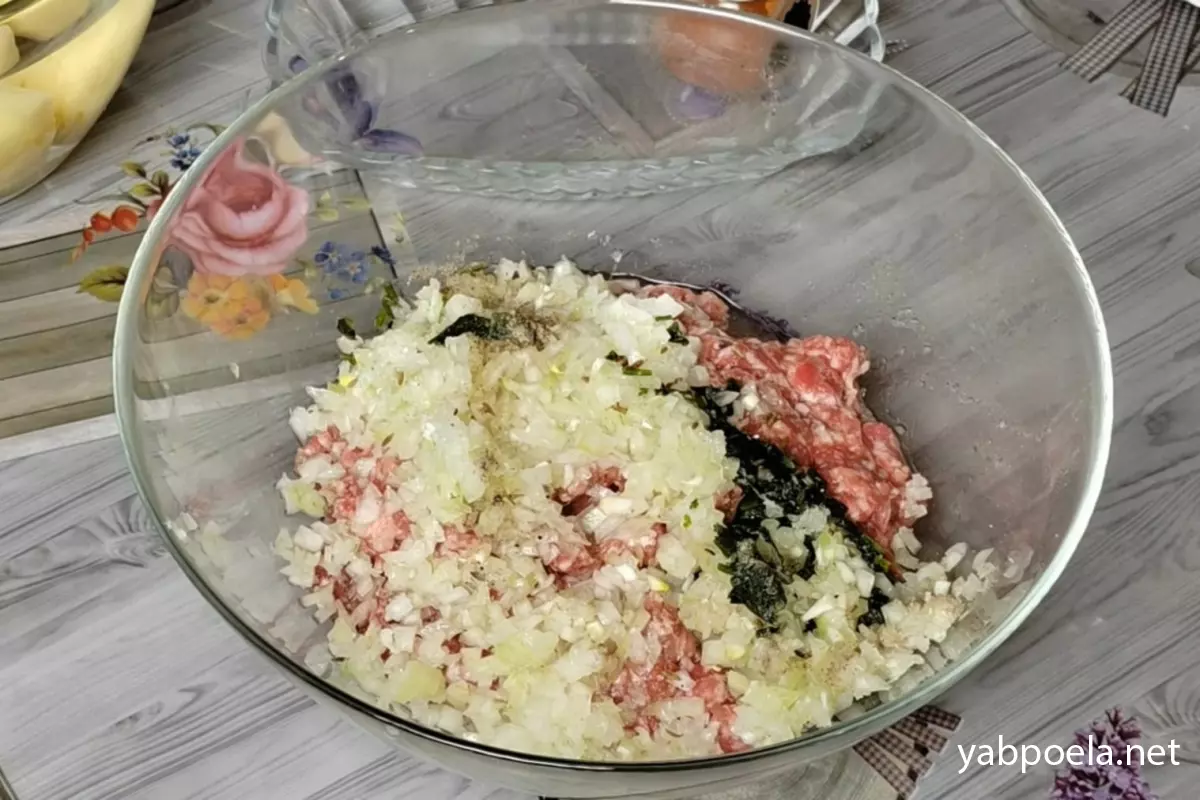 Возьмите одну среднюю луковицу и нарежьте ее максимально мелко (чтобы она отдала сок, но не чувствовалась крупными кусками в готовом мясе). Отправьте нарезанный лук в глубокую миску к фаршу. Вторую луковицу нарежьте кольцами или полукольцами и пока отложите в сторону — она понадобится для гарнира.
