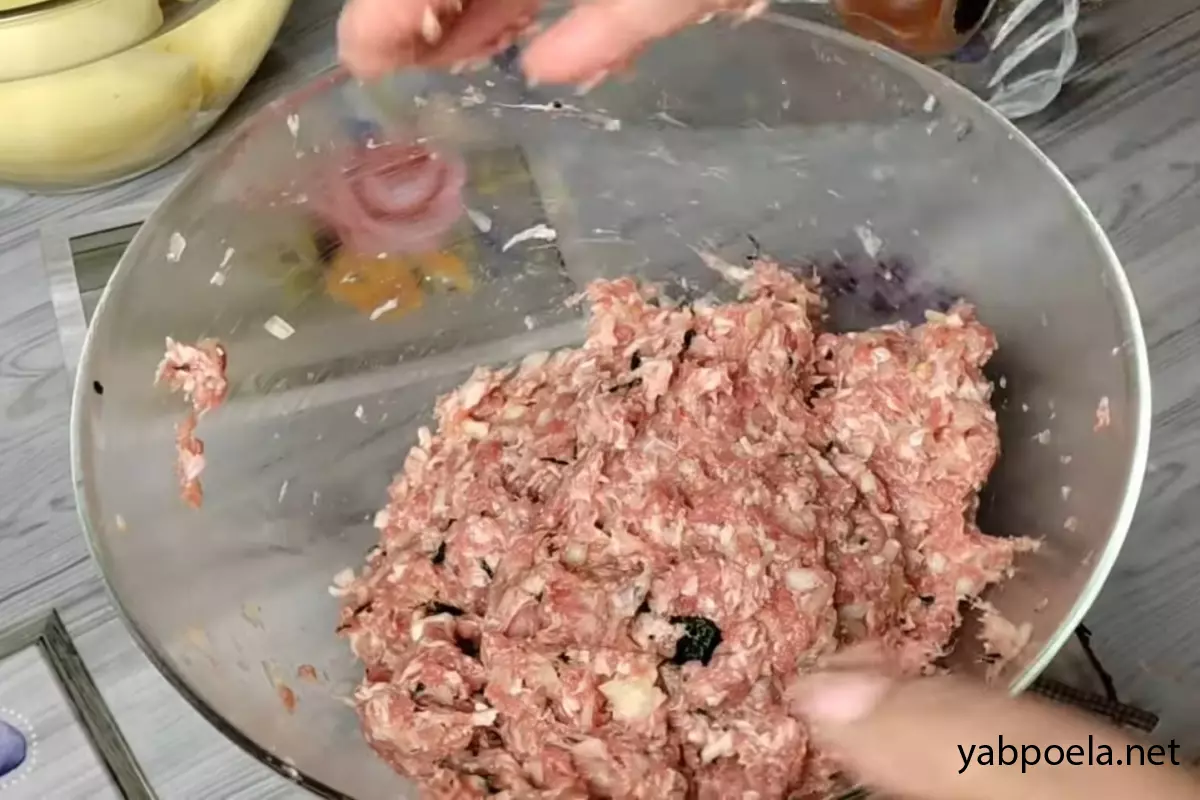 Тщательно вымешайте фарш руками до однородного, вязкого состояния.