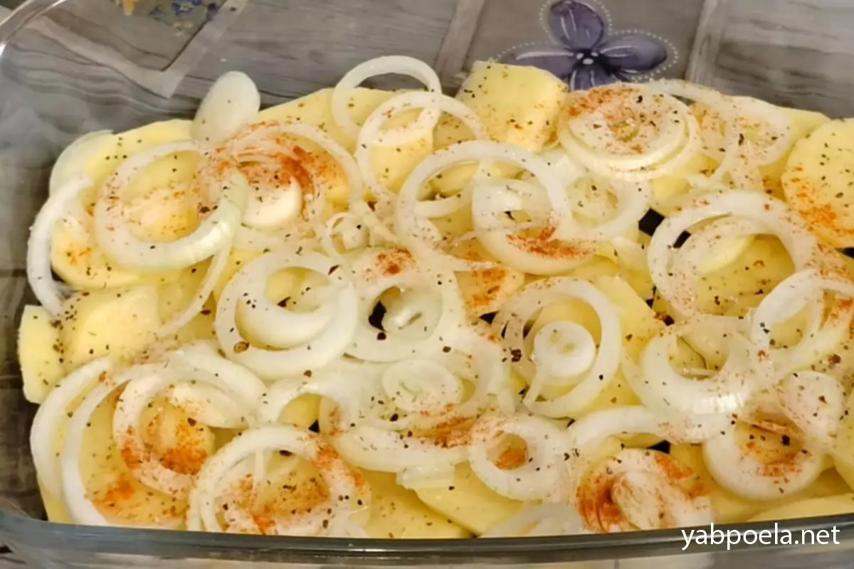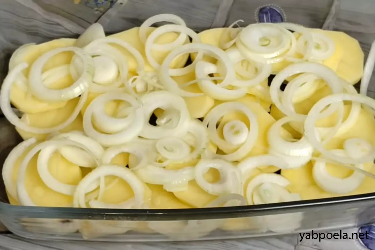 Очищенный картофель (3-4 штуки) нарежьте ровными кружочками толщиной примерно 0.5 см. Возьмите форму для запекания и равномерно выложите картофель на дно. Сверху распределите лук, нарезанный кольцами.