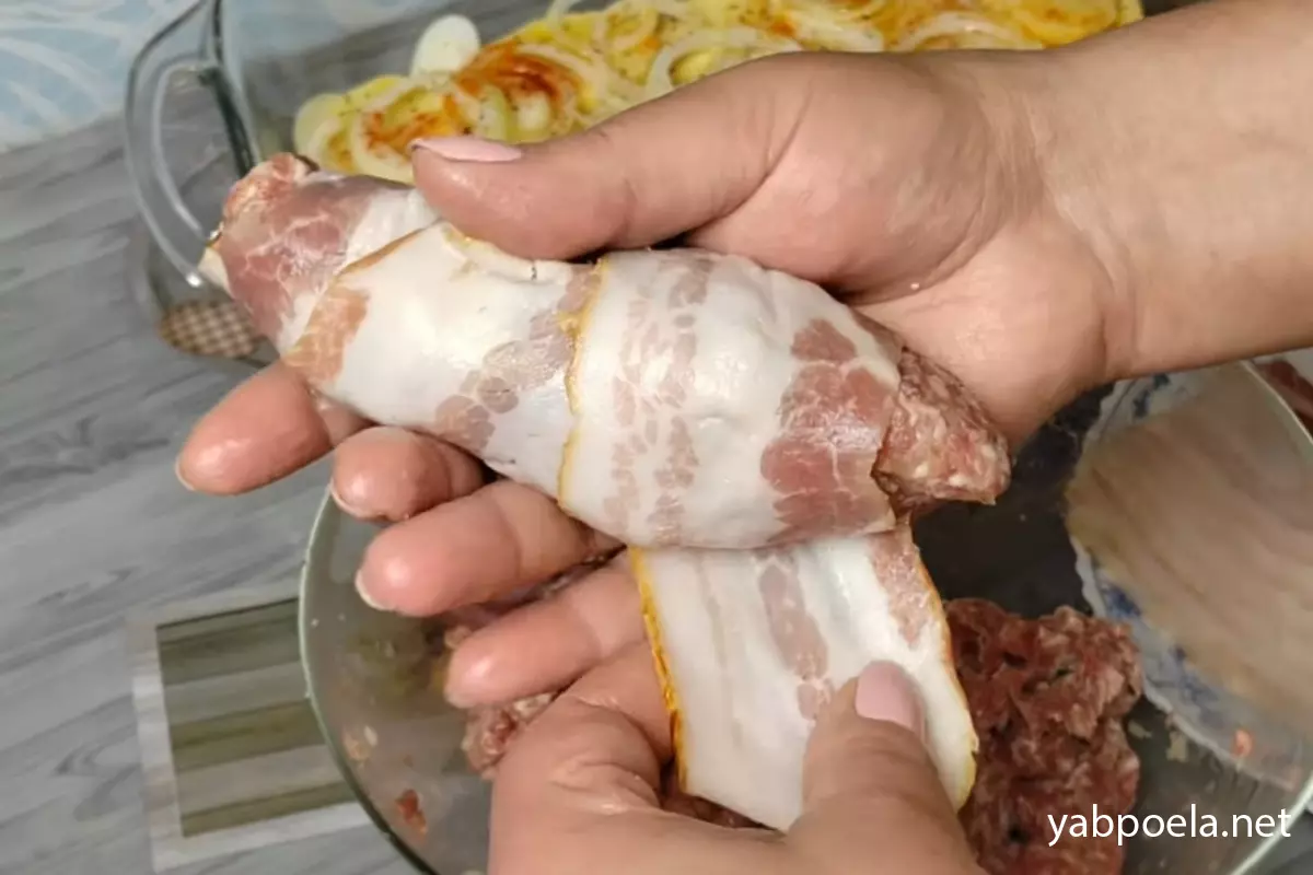 Каждую продолговатую мясную заготовку аккуратно оберните полоской сырокопченого бекона по спирали. Если котлетка длинная, используйте две полоски. Бекон должен плотно «запечатать» фарш, чтобы весь сок остался внутри при запекании.