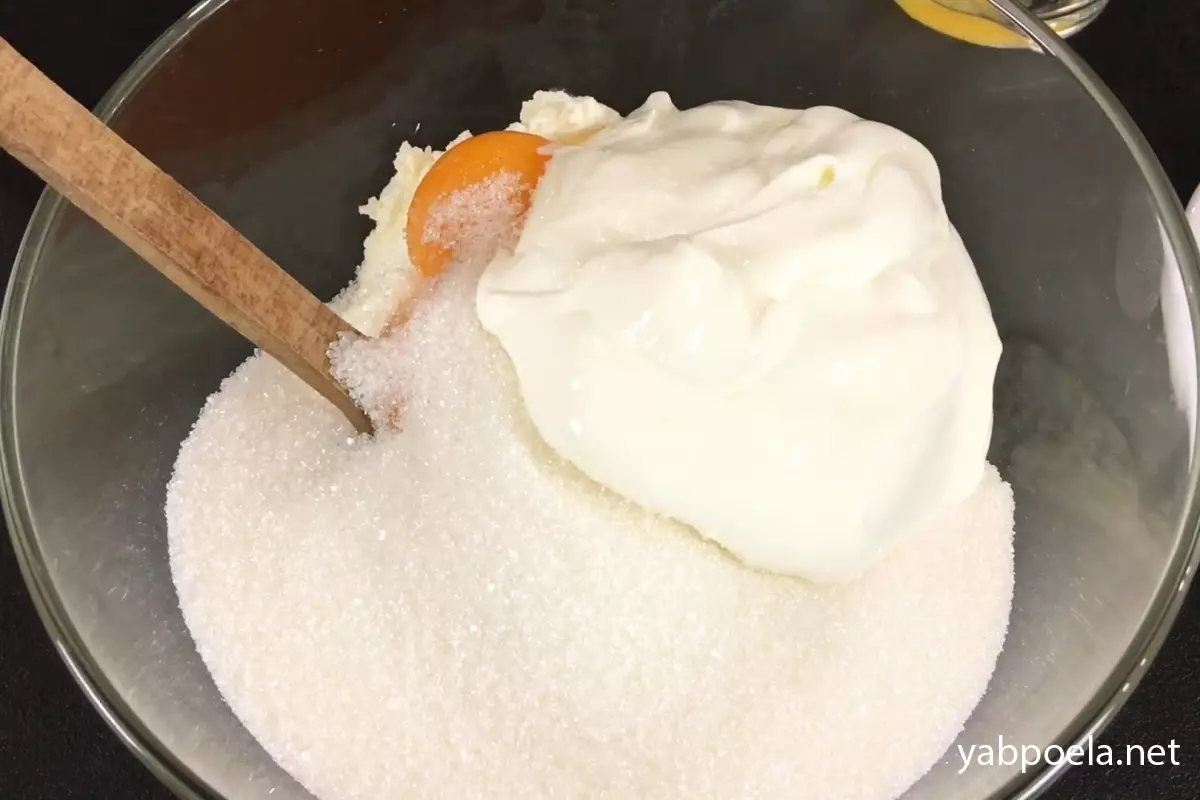 В подготовленную гладкую творожную массу добавьте яичные желтки, обычный сахар, ванильный сахар и жирную сметану. Тщательно всё перемешайте.
