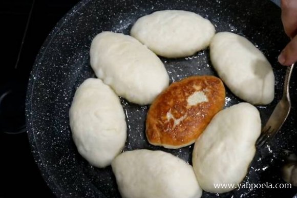 Разогрейте сковороду, влейте туда растительное масло. Обжаривайте пирожки с обеих сторон до румяной корочки.