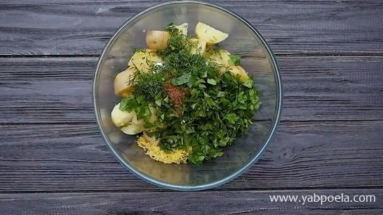 Прямо в салатнице аккуратно подкидывайте картофель, чтобы все ингредиенты равномерно распределились и смешались. Посолите по вкусу.