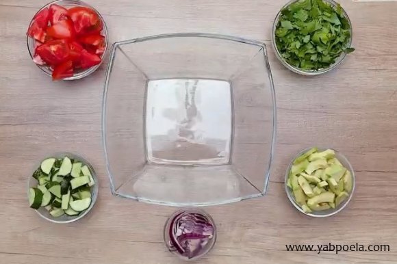 Смешайте в глубокой миске все нарезанные ингредиенты.