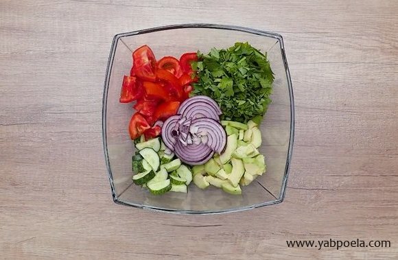 Авокадо очистите, удалите косточку и нарежьте некрупными кусочками. Нарежьте огурцы и помидоры, нарубите зелень, а лук нашинкуйте тонкими полукольцами.