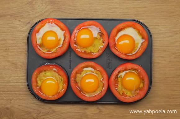 Аккуратно вбейте в каждый помидорчик по яйцу так, чтобы желток сохранился целым.