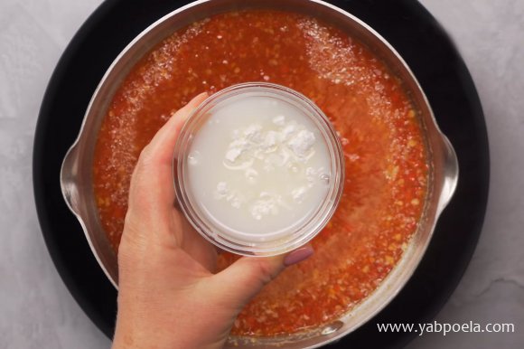 Смешайте отдельно крахмал с 50 мл воды, перемешайте и добавьте в сотейник к перцам.