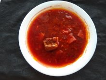 Готовлю на бульоне из свиных ребер. Для заправки тушу овощи с добавлением небольшого количества лимонного сока. А все потому, что свекла сохраняет свои красящие свойства в кислой среде, это и делает борщ насыщенного красного цвета.