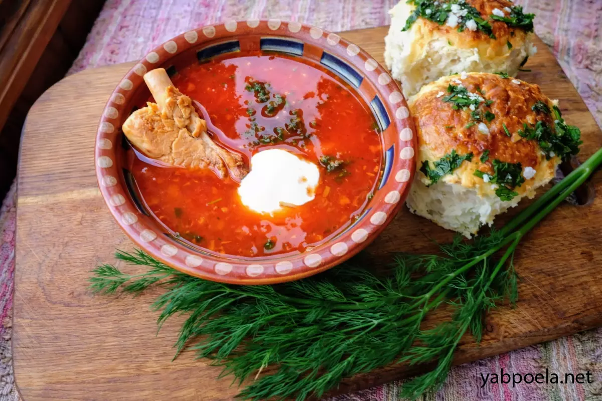 Самый вкусный красный борщ готов! Подаем горячим со сметаной, а еще к нему можно приготовить пампушки с чесноком и зеленью.