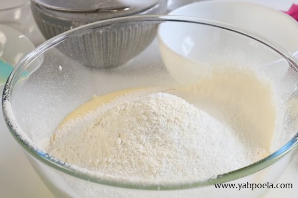 Сюда же просеиваем муку. Добавляем соду, разрыхлитель и кокосовую стружку.