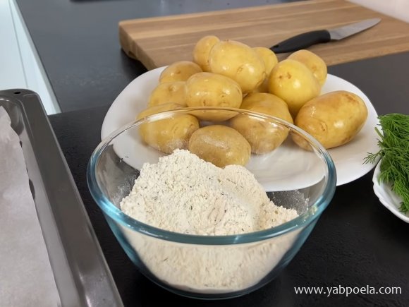 Обваливаем каждую картошину в муке. Картошка обязательно должна быть мокрой, так мука к ней хорошо будет приставать.