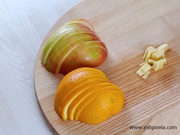 По половинке яблока и апельсина нарезаем слайсами. Измельчаем имбирь.