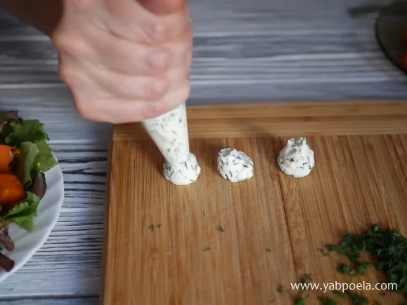 Делаем сырные шарики и раскладываем их сверху на салат. Перемешивать салат не надо.